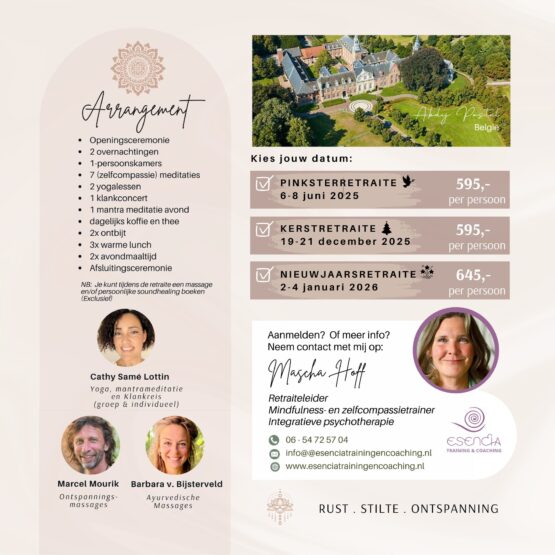 Mascha Hoff is een ervaren trainer en begeleider van retraites. Naast de meditatie-uren heb je ook dagelijks een optie op een 1-op 1 gesprek Mascha.